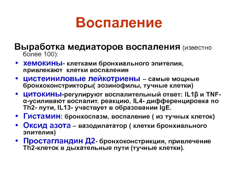 Гистамин: бронхоспазм, воспаление ( из тучных клеток)