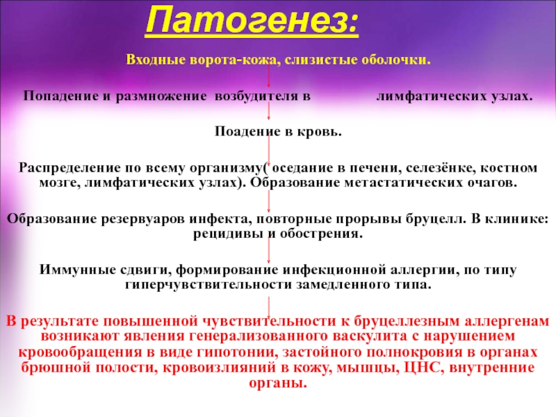В результате повышенной чувствительности к бруцеллезным аллергенам возникают явления генерализованного васкулита с нарушением кровообращения в виде гипотонии, застойного полнокровия в органах брюшной полости, кровоизлияний в кожу, мышцы, ЦНС, внутренние органы.
