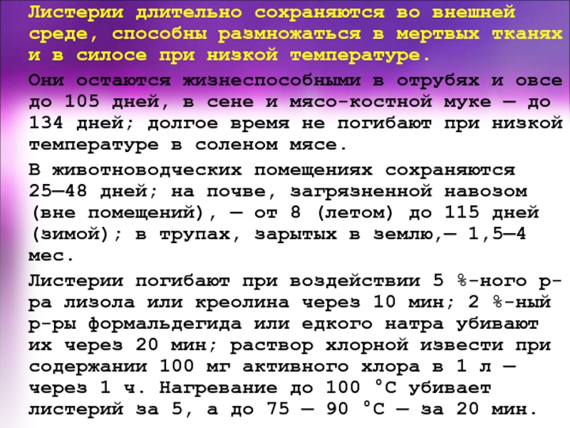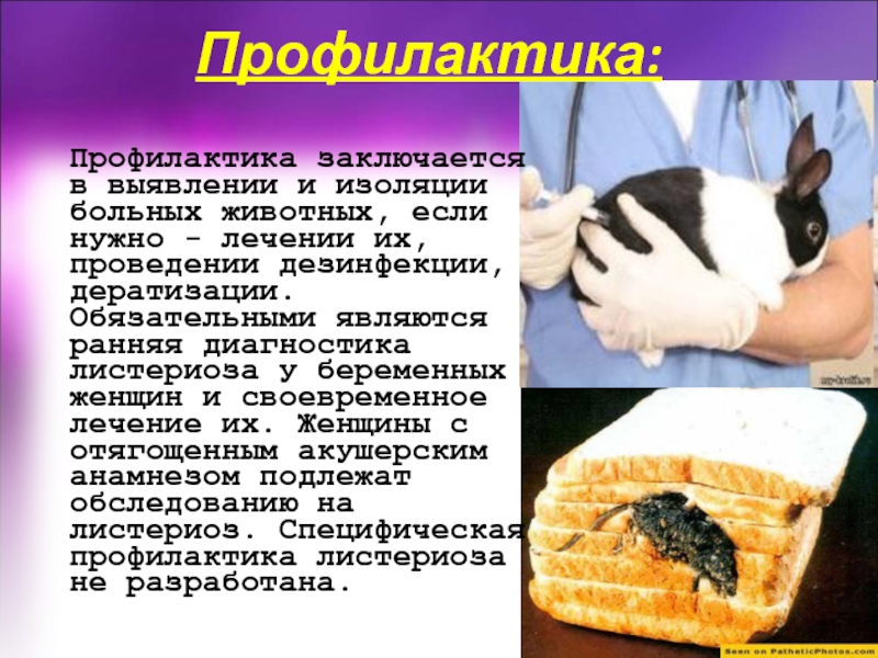 дезинфекции, дератизации. Обязательными являются ранняя диагностика листериоза у беременных женщин и своевременное лечение их. Женщины с отягощенным акушерским анамнезом подлежат обследованию на листериоз. Специфическая профилактика листериоза не разработана.