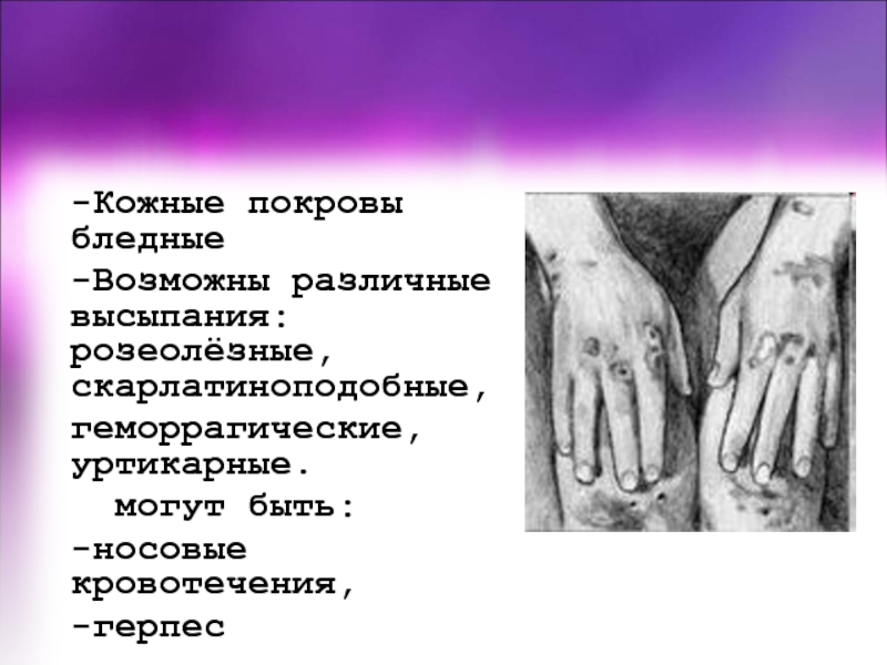 или папулёзная, розеолёзная или геморрагическая сыпь.