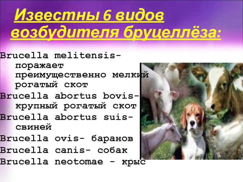 Слайд 3 Известны 6 видов возбудителя бруцеллёза: