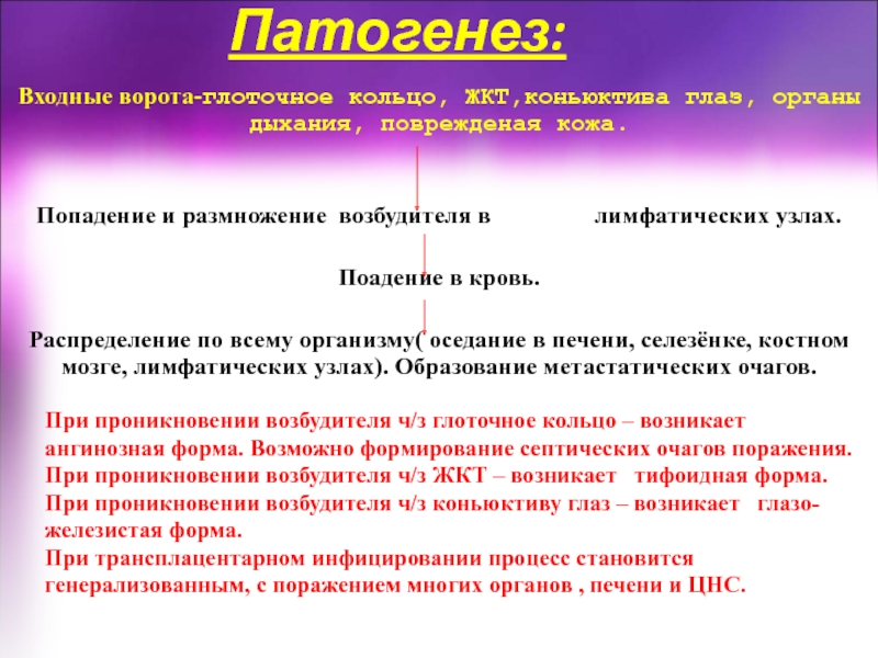 При проникновении возбудителя ч/з глоточное кольцо – возникает    ангинозная форма. Возможно формирование септических очагов поражения.