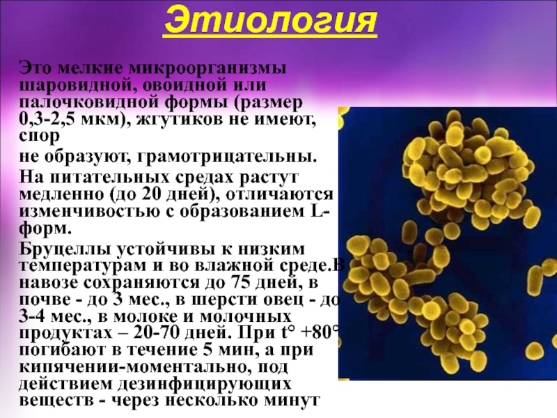 Бруцеллы устойчивы к низким температурам и во влажной среде.В навозе сохраняются до 75 дней, в почве - до 3 мес., в шерсти овец - до 3-4 мес., в молоке и молочных продуктах – 20-70 дней. При t° +80° погибают в течение 5 мин, а при кипячении-моментально, под действием дезинфицирующих веществ - через несколько минут