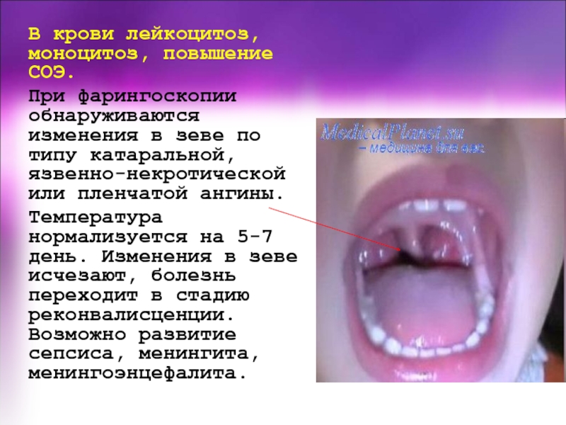 5-7 день. Изменения в зеве исчезают, болезнь переходит в стадию реконвалисценции. Возможно развитие сепсиса, менингита, менингоэнцефалита.