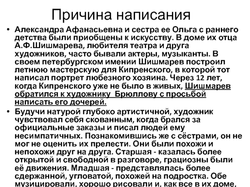 Будучи натурой глубоко артистичной, художник чувствовал себя скованным, когда брался за официальные заказы и писал людей ему несимпатичных. Познакомившись же с сёстрами, он не мог не оценить их прелести. Они были похожи и непохожи друг на друга. Старшая - казалась более открытой и свободной в разговоре, грациозны были её движения. Младшая - представлялась более сдержанной, угловатой, похожей на подростка. Обе музицировали, хорошо рисовали и, как все в их доме, увлечены искусством и литературой.