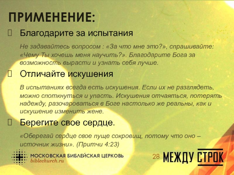 В испытаниях всегда есть искушения. Если их не разглядеть, можно споткнуться и упасть. Искушения отчаяться, потерять надежду, разочароваться в Боге настолько же реальны, как и искушение изменить жене.