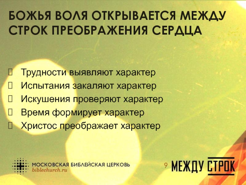 Слайд 9Божья воля открывается между строк преображения сердца