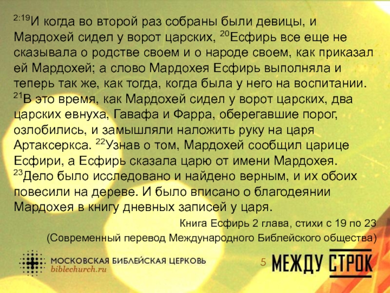 Слайд 52:19И когда во второй раз собраны были девицы, и Мардохей