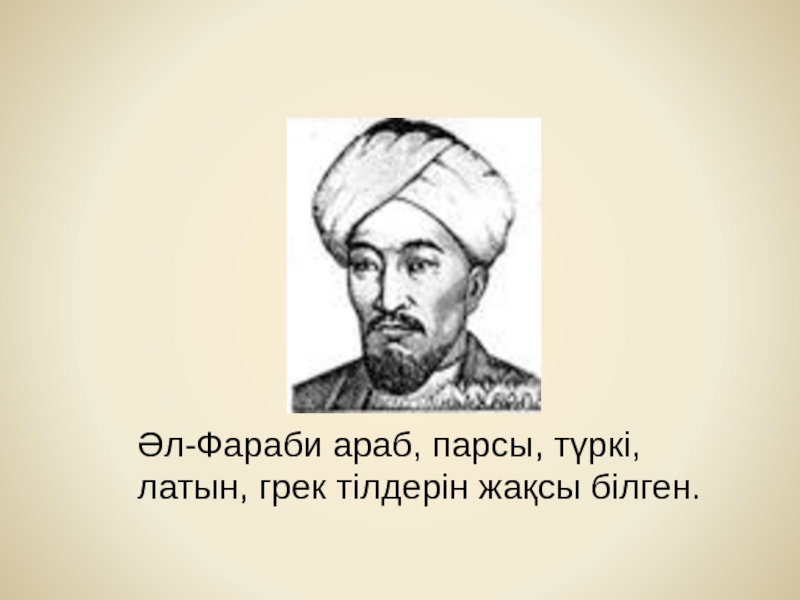 Слайд 6 Әл-Фараби араб, парсы, түркі, латын, грек тілдерін жақсы