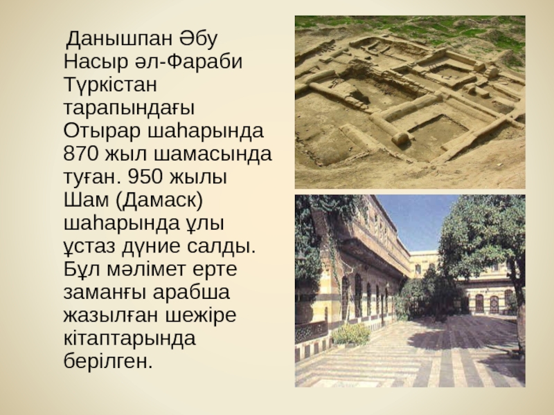 Слайд 2 Данышпан Әбу Насыр әл-Фараби Түркістан тарапындағы Отырар шаһарында