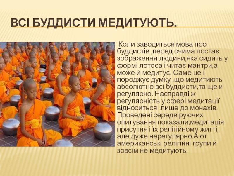 й медитує. Саме це і породжує думку ,що медитиють абсолютно всі буддисти,та ще й регулярно. Насправді ж регулярність у сфері медитації відноситься лише до монахів. Проведені середвіруючих опитування показали,медитація присутня і їх релігійному житті,але дуже нерегулярно.А от американські релігійні групи й зовсім не медитують.