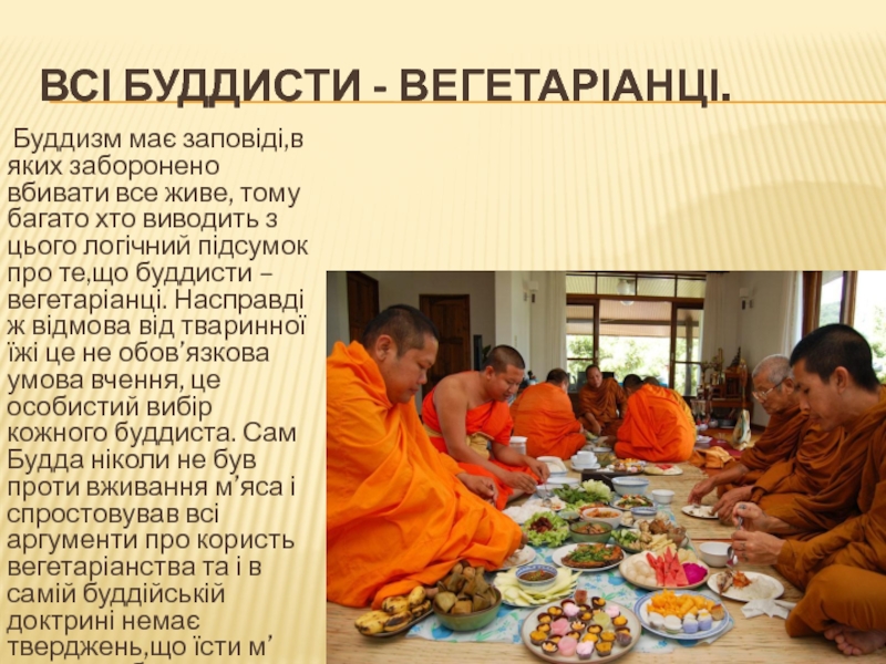 те,що буддисти – вегетаріанці. Насправді ж відмова від тваринної їжі це не обов’язкова умова вчення, це особистий вибір кожного буддиста. Сам Будда ніколи не був проти вживання м’яса і спростовував всі аргументи про користь вегетаріанства та і в самій буддійській доктрині немає тверджень,що їсти м’ясо – це вбивство.