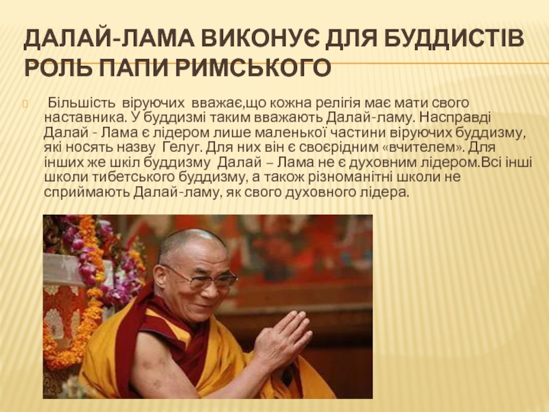 Слайд 6Далай-лама виконує для буддистів роль Папи Римського