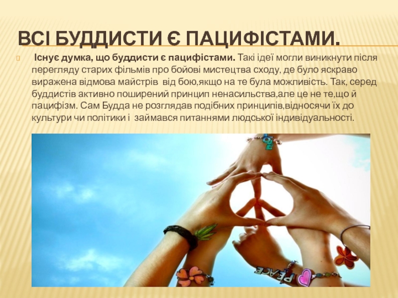 сходу, де було яскраво виражена відмова майстрів від бою,якщо на те була можливість. Так, серед буддистів активно поширений принцип ненасильства,але це не те,що й пацифізм. Сам Будда не розглядав подібних принципів,відносячи їх до культури чи політики і займався питаннями людської індивідуальності.