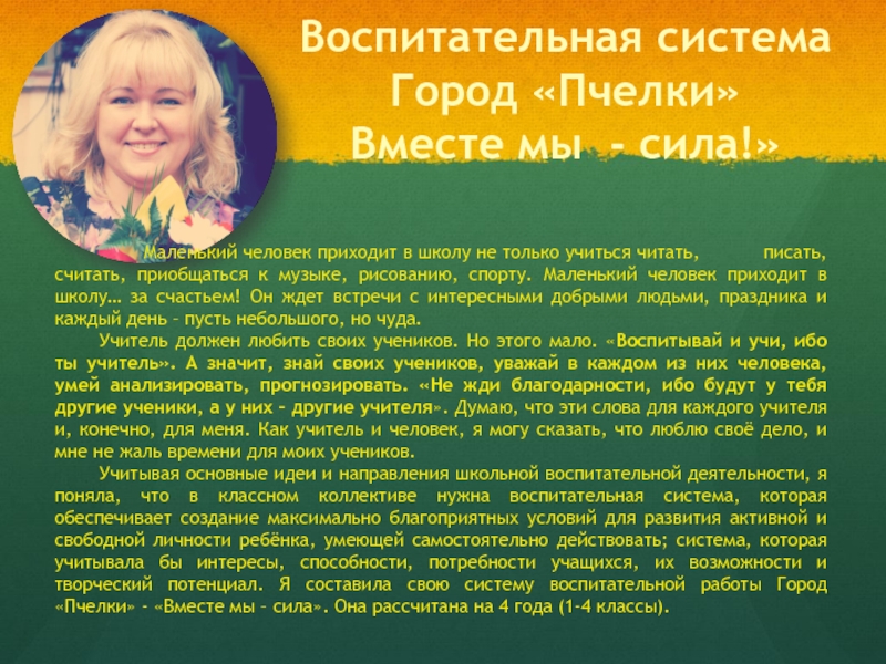 Учитывая основные идеи и направления школьной воспитательной деятельности, я поняла, что в классном коллективе нужна воспитательная система, которая обеспечивает создание максимально благоприятных условий для развития активной и свободной личности ребёнка, умеющей самостоятельно действовать; система, которая учитывала бы интересы, способности, потребности учащихся, их возможности и творческий потенциал. Я составила свою систему воспитательной работы Город «Пчелки» - «Вместе мы – сила». Она рассчитана на 4 года (1-4 классы).