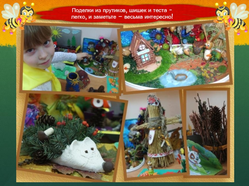 Слайд 16Поделки из прутиков, шишек и теста - легко, и заметьте