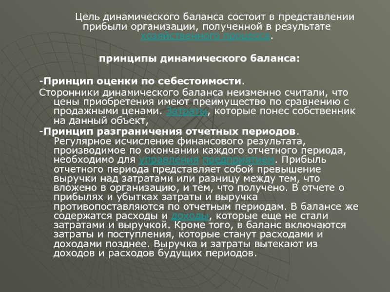 лежащий в основе динамической концепции, призван обеспечить возможность измерения результативности хозяйственной деятельности организаций. В отличие от статической концепции, где финансовый результат выявляется сопоставлением капитала собственника на конец и начало отчетного периода, в динамической концепции финансовый результат формируется сопоставлением полученных доходов и относящихся к ним расходов