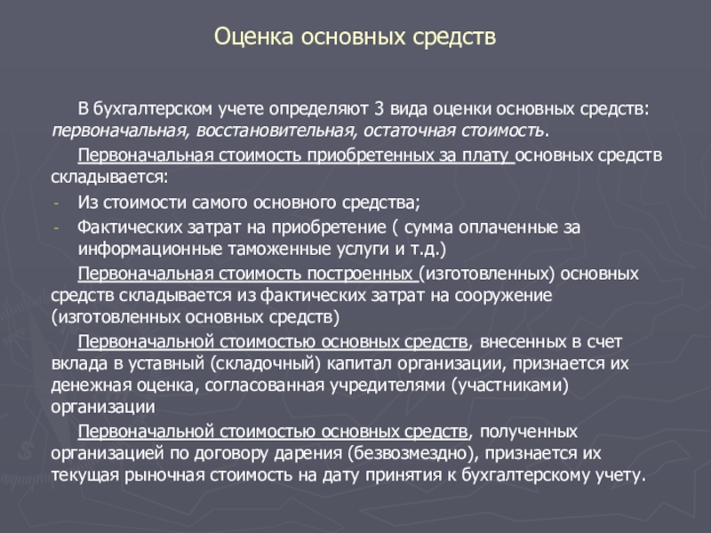 В бухгалтерском учете определяют 3 вида оценки основных