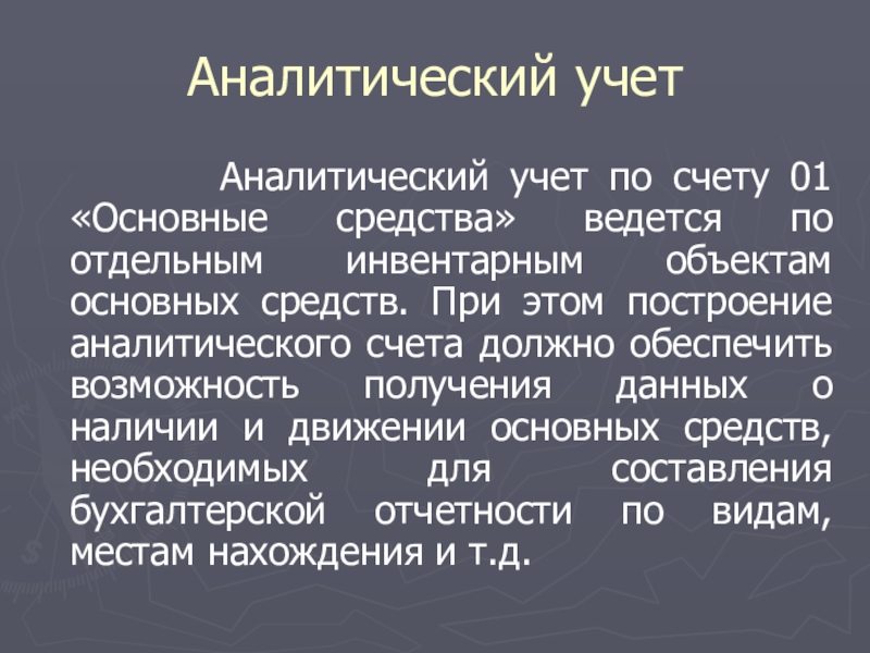 При этом построение аналитического счета должно обеспечить возможность получения данных о наличии и движении основных средств, необходимых для составления бухгалтерской отчетности по видам, местам нахождения и т.д.