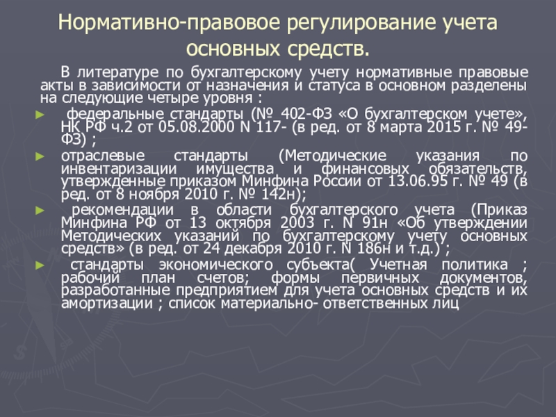 Слайд 8Нормативно-правовое регулирование учета основных средств.