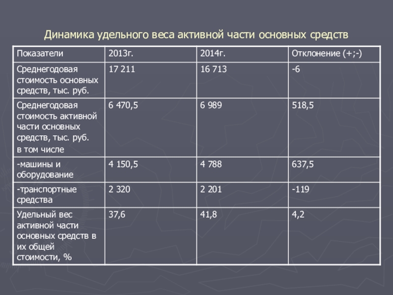 Слайд 22Динамика удельного веса активной части основных средств
