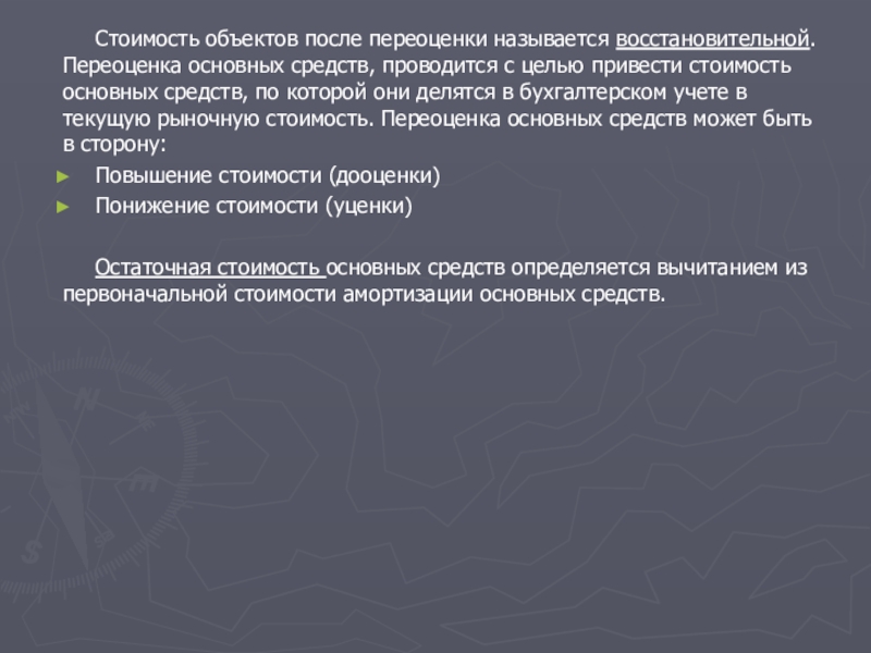 Слайд 7Стоимость объектов после переоценки называется восстановительной. Переоценка основных средств, проводится
