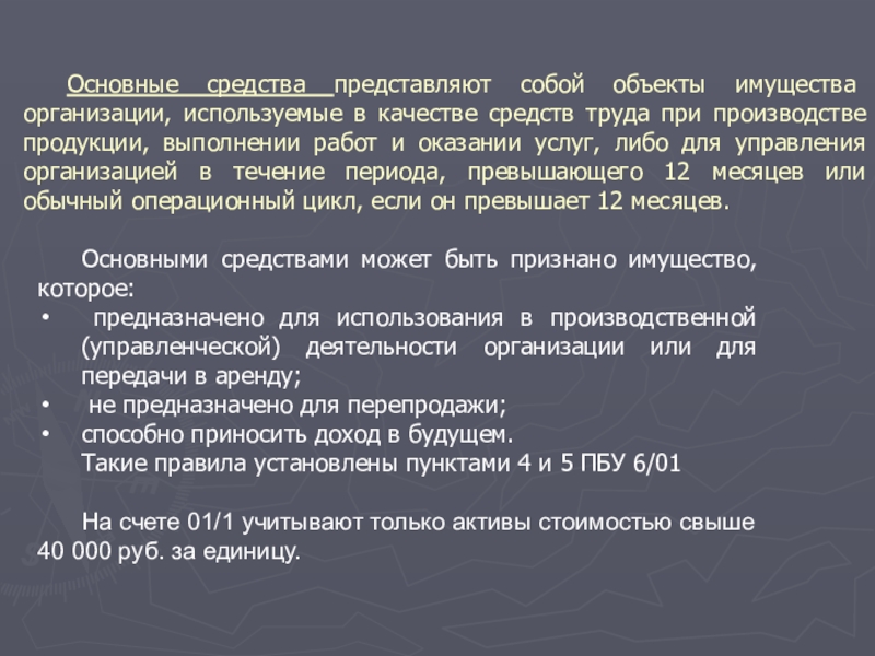 Слайд 4Основные средства представляют собой объекты имущества организации, используемые в качестве
