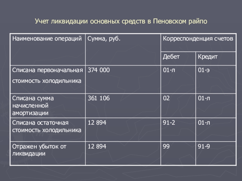Слайд 18Учет ликвидации основных средств в Пеновском райпо