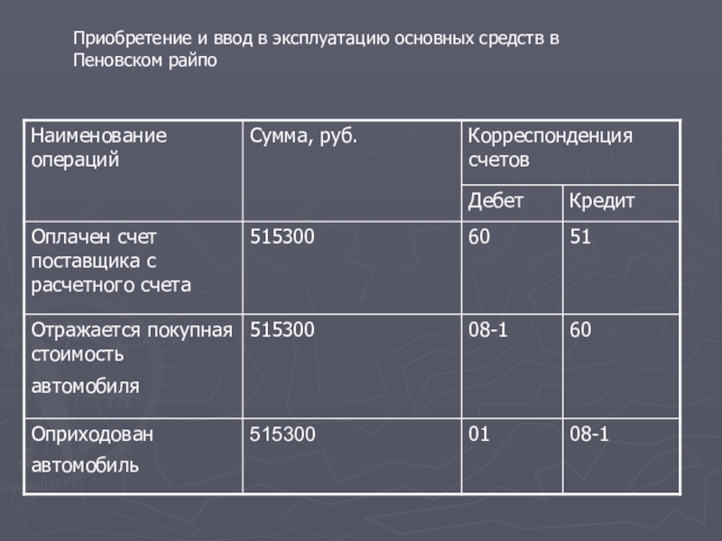 Слайд 16Приобретение и ввод в эксплуатацию основных средств в Пеновском райпо