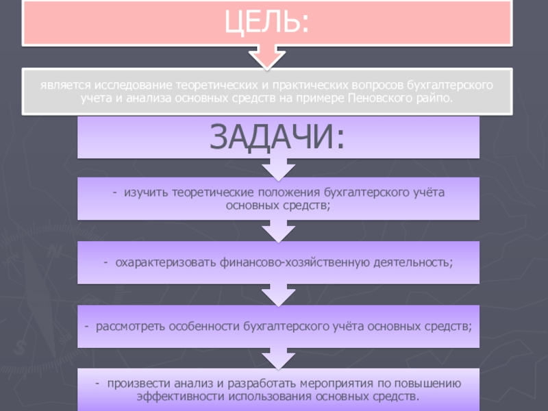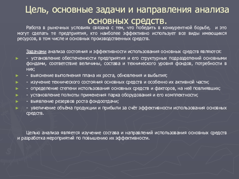 Слайд 9Цель, основные задачи и направления анализа основных средств.