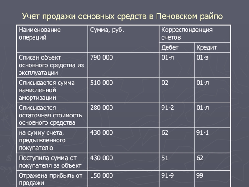 Слайд 17Учет продажи основных средств в Пеновском райпо