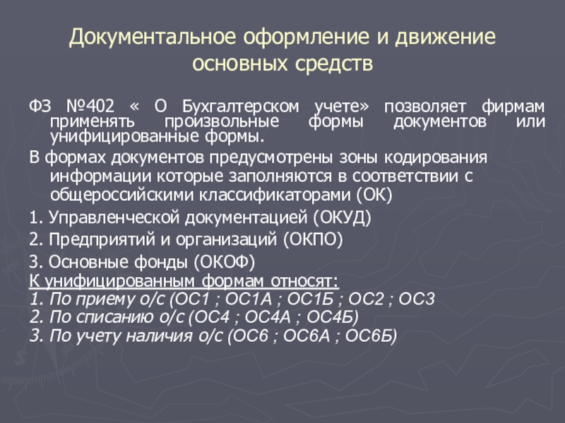 Слайд 13Документальное оформление и движение основных средств