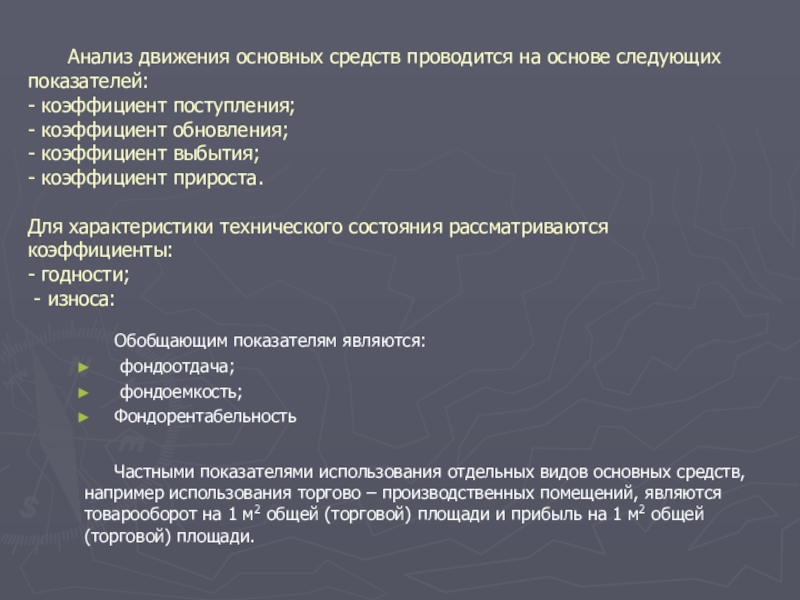 Слайд 10Анализ движения основных средств проводится на основе следующих показателей: