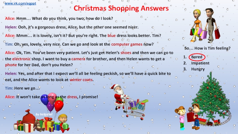Alice: Ok, Tim. You’ve been very patient. Let’s just get Helen’s and then we can go to the shop. I want to buy a for brother, and then Helen wants to get a for her Dad, don’t you Helen?