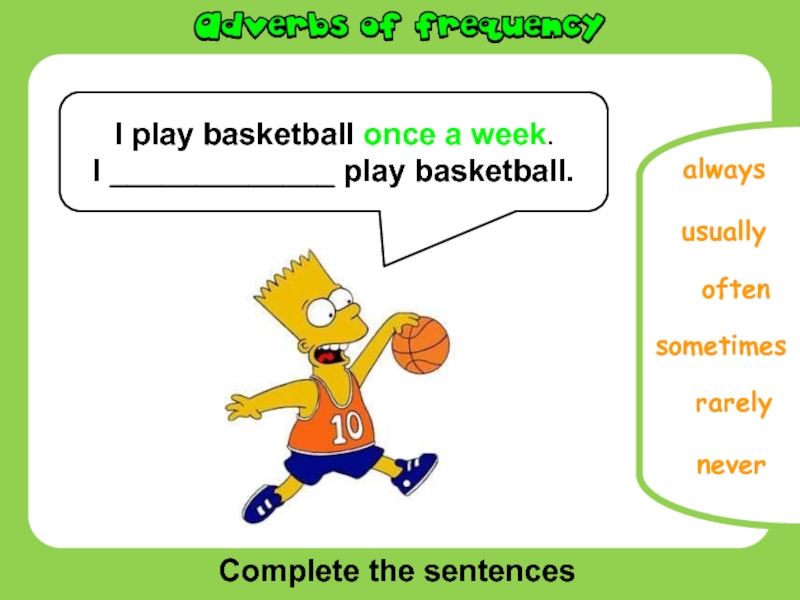 Complete the sentencesoftenusuallyneverrarelyalwaysI play basketball once a week.I _____________ play basketball.sometimes