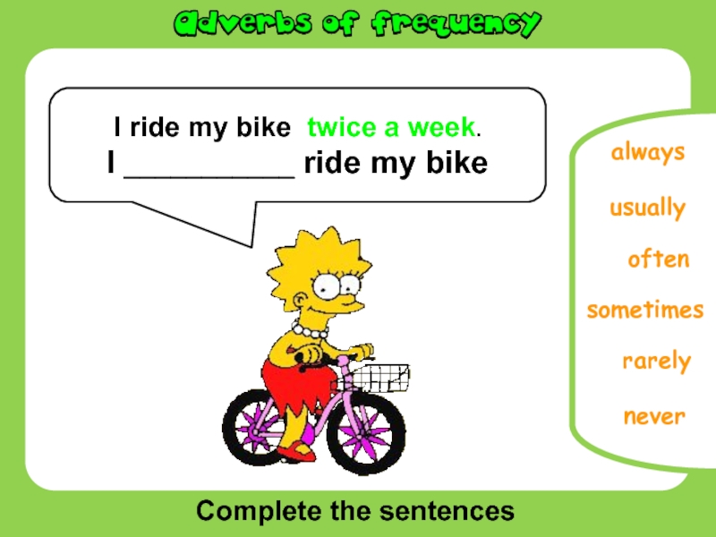 Complete the sentencesusuallyneversometimesrarelyalwaysI ride my bike twice a week.I ___________ ride my bikeoften