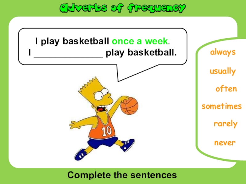 Complete the sentencesoftenusuallyneverrarelyalwaysI play basketball once a week.I _____________ play basketball.sometimes