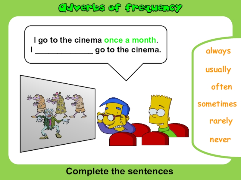 Complete the sentencesoftenusuallyneversometimesalwaysI go to the cinema once a month.I _____________ go to the cinema.rarely