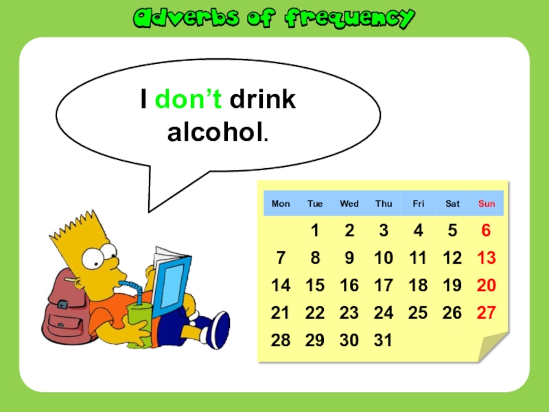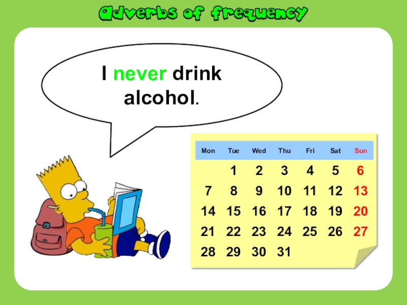 Слайд 13I never drink alcohol.