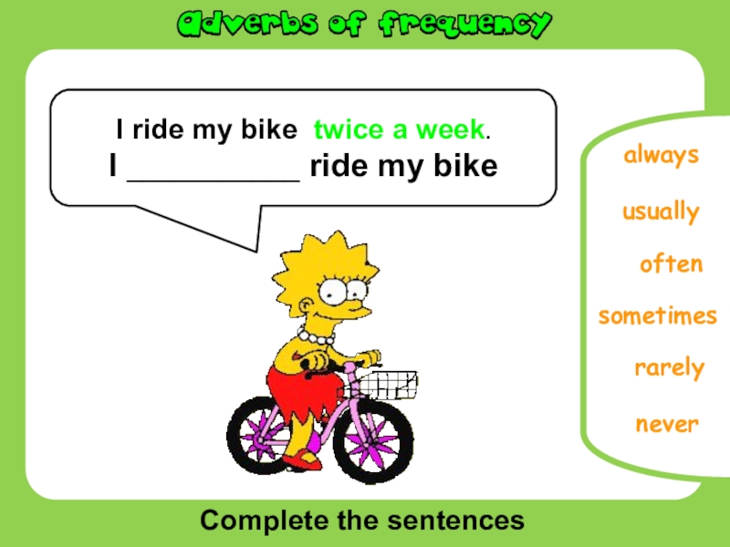 Complete the sentencesusuallyneversometimesrarelyalwaysI ride my bike twice a week.I ___________ ride my bikeoften