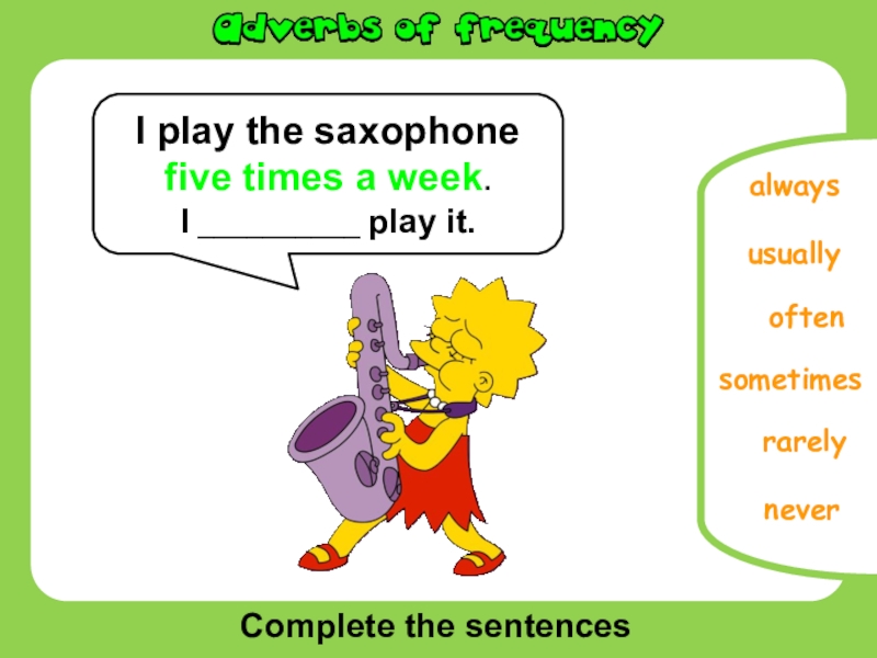 Complete the sentencesoftenneversometimesrarelyalwaysI play the saxophone five times a week.I __________ play it.usually