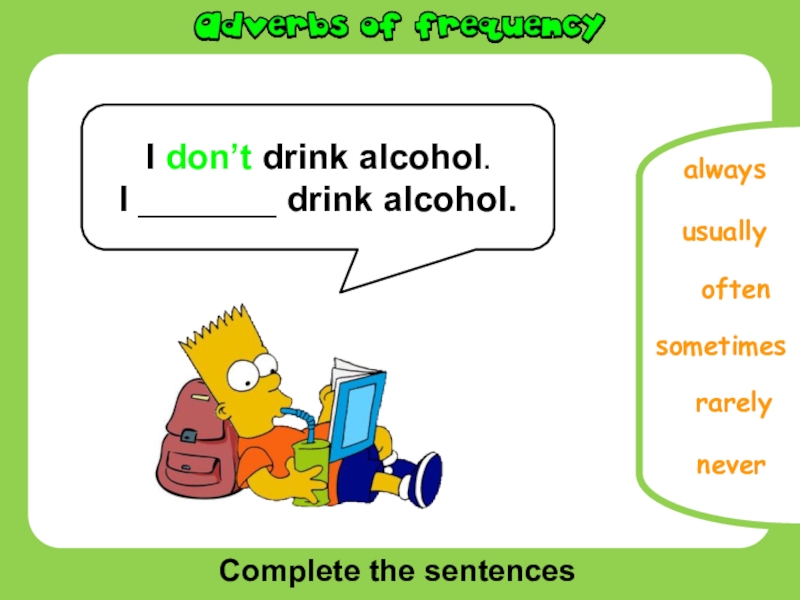 Complete the sentencesoftenusuallysometimesrarelyalwaysI don’t drink alcohol.I _______ drink alcohol.never