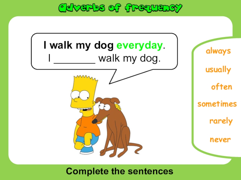Complete the sentencesoftenusuallyneversometimesrarelyI walk my dog everyday.I _______ walk my dog.always