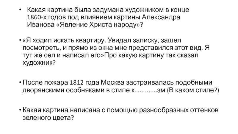 картины не попали на корабль, на котором они должны были плыть в Америку.С тех пор Поленов опасался отправлять картины морем. Как назывался тот самый корабль?Историческая достоверность – один из главных столпов, на которых должно было держаться полотно. Недаром художник развернул действие на фоне повседневной жизни восточного города. Люди входят в храм, не обращая внимание на происходящее внизу лестницы, развешано белье, лежат корзины с товаром.О какой это картине?