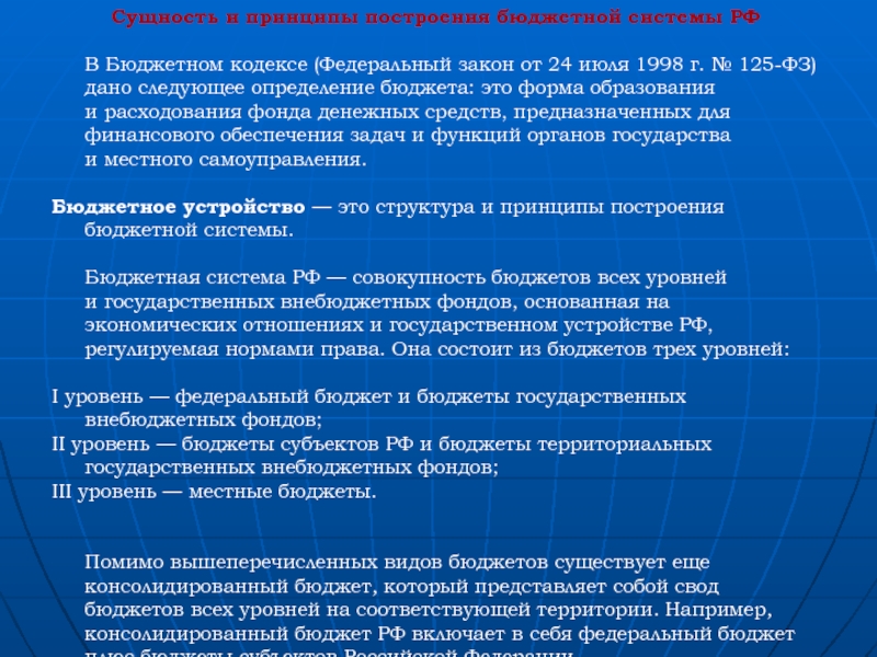 Сущность и принципы построения бюджетной системы РФ В Бюджетном кодексе (Федеральный закон от