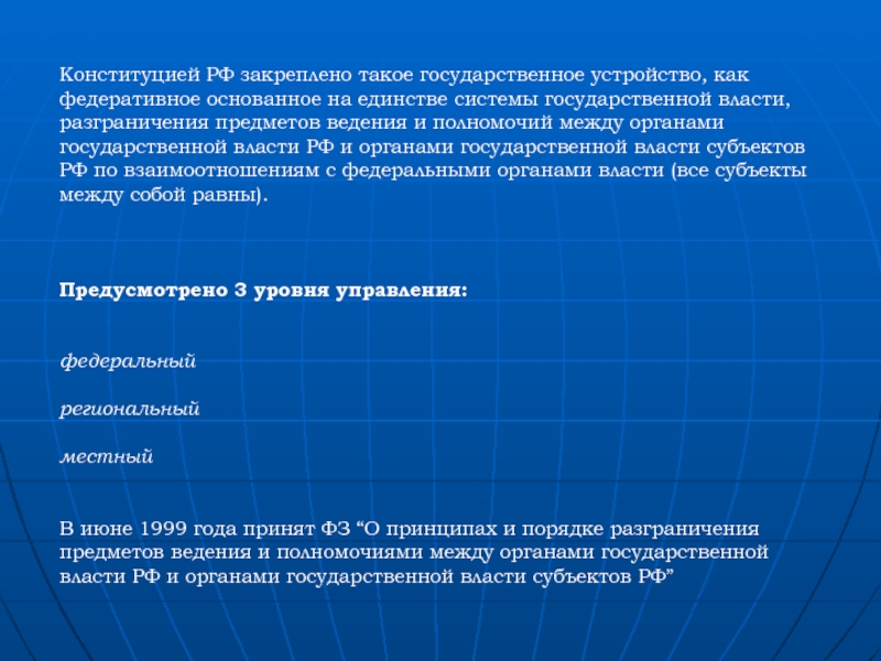 Конституцией РФ закреплено такое государственное устройство, как федеративное основанное на единстве системы государственной власти, разграничения предметов ведения