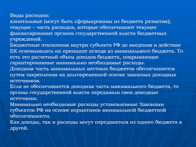 Бюджетные отношения внутри субъекта РФ до введения в действие БК основывались на принципе исходя из минимального бюджета. То есть это расчетный объем доходов бюджета, покрывающие гарантированные минимально необходимые расходы.