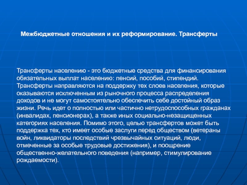 Межбюджетные отношения и их реформирование. Трансферты Трансферты населению - это бюджетные средства для финансирования обязательных выплат населению: