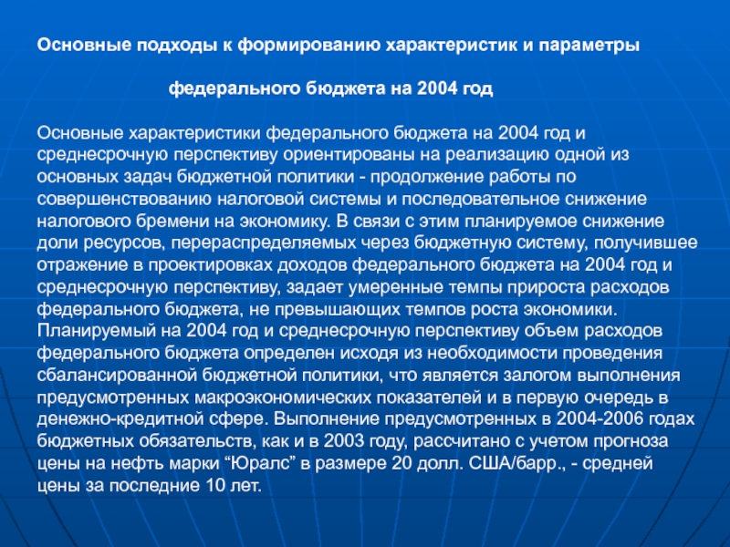 Основные характеристики федерального бюджета на 2004 год и среднесрочную перспективу ориентированы на реализацию одной из основных задач бюджетной политики - продолжение работы по совершенствованию налоговой системы и последовательное снижение налогового бремени на экономику. В связи с этим планируемое снижение доли ресурсов, перераспределяемых через бюджетную систему, получившее отражение в проектировках доходов федерального бюджета на 2004 год и среднесрочную перспективу, задает умеренные темпы прироста расходов федерального бюджета, не превышающих темпов роста экономики. Планируемый на 2004 год и среднесрочную перспективу объем расходов федерального бюджета определен исходя из необходимости проведения сбалансированной бюджетной политики, что является залогом выполнения предусмотренных макроэкономических показателей и в первую очередь в денежно-кредитной сфере. Выполнение предусмотренных в 2004-2006 годах бюджетных обязательств, как и в 2003 году, рассчитано с учетом прогноза цены на нефть марки “Юралс” в размере 20 долл. США/барр., - средней цены за последние 10 лет.