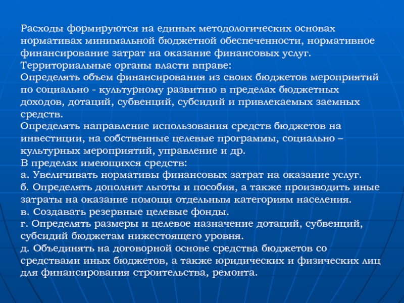 Расходы формируются на единых методологических основах нормативах минимальной бюджетной обеспеченности, нормативное финансирование затрат на оказание финансовых услуг.Территориальные